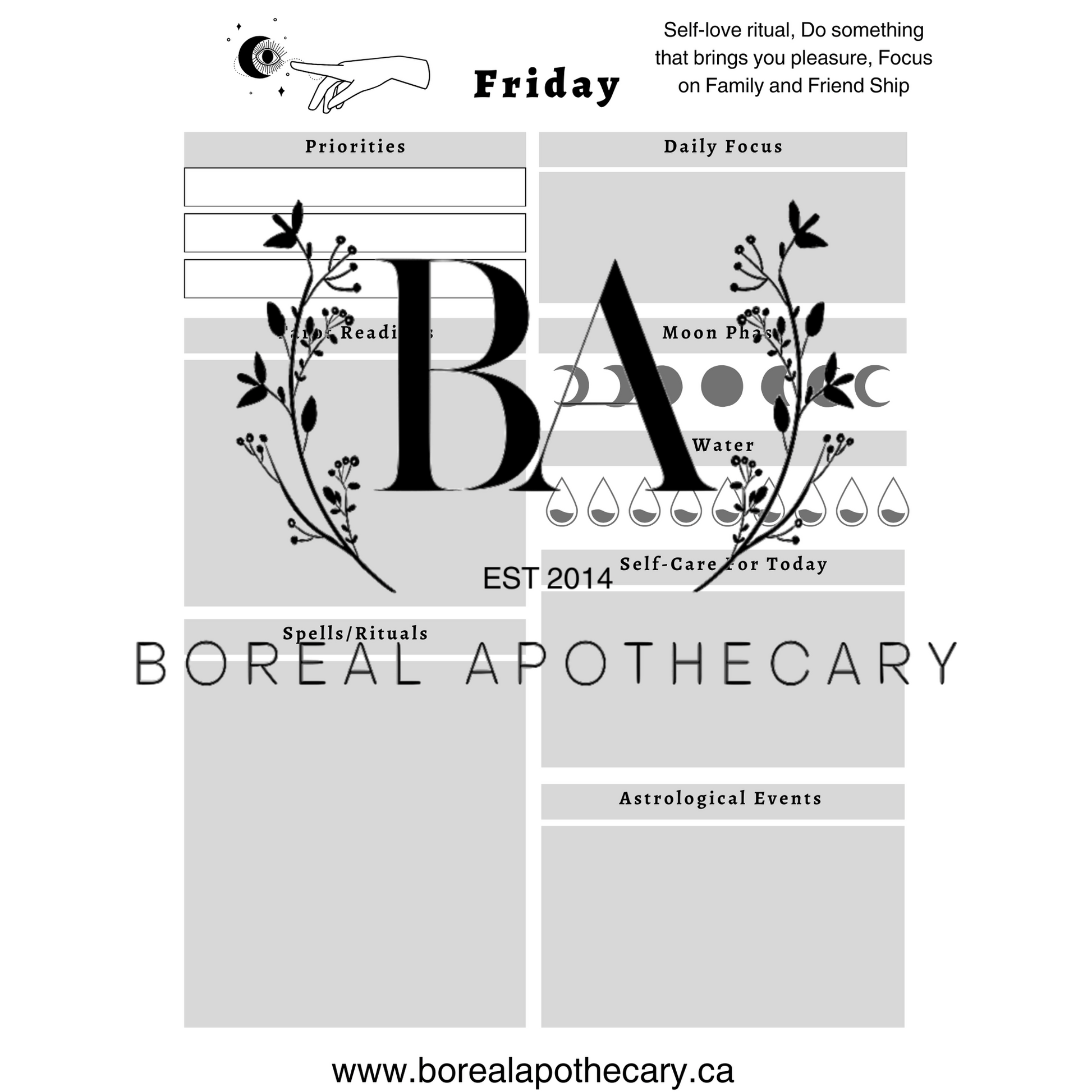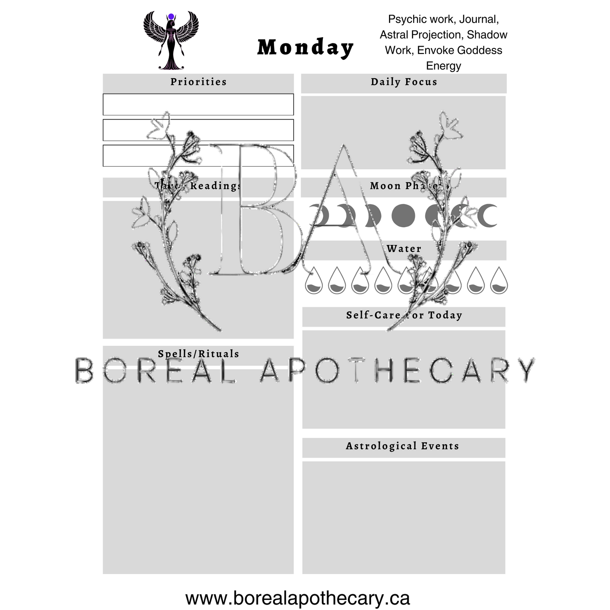 The Boreal Apothecary Witch’s Planner is a beautifully designed, printable PDF filled with enchanting pages to help you organize your spellwork, track moon phases, set intentions, and keep your witchcraft practice grounded and empowered.